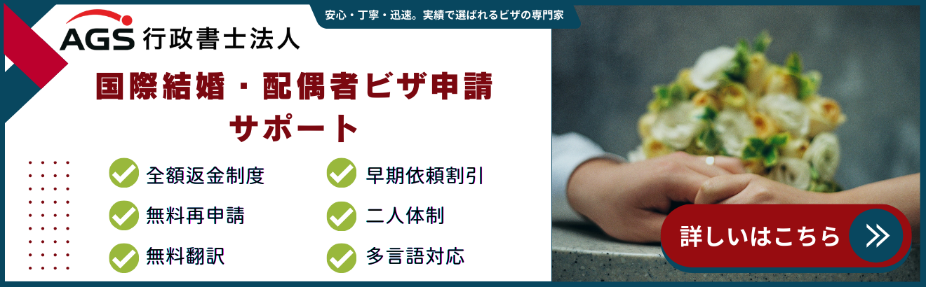 AGS行政書士法人では、これまで多数の配偶者ビザ申請をサポートしており、お一人おひとりの状況に合わせた書類作成や理由書の作成もお手伝いしています。不安な方や一度不許可になった方も、どうぞお気軽にご相談ください。